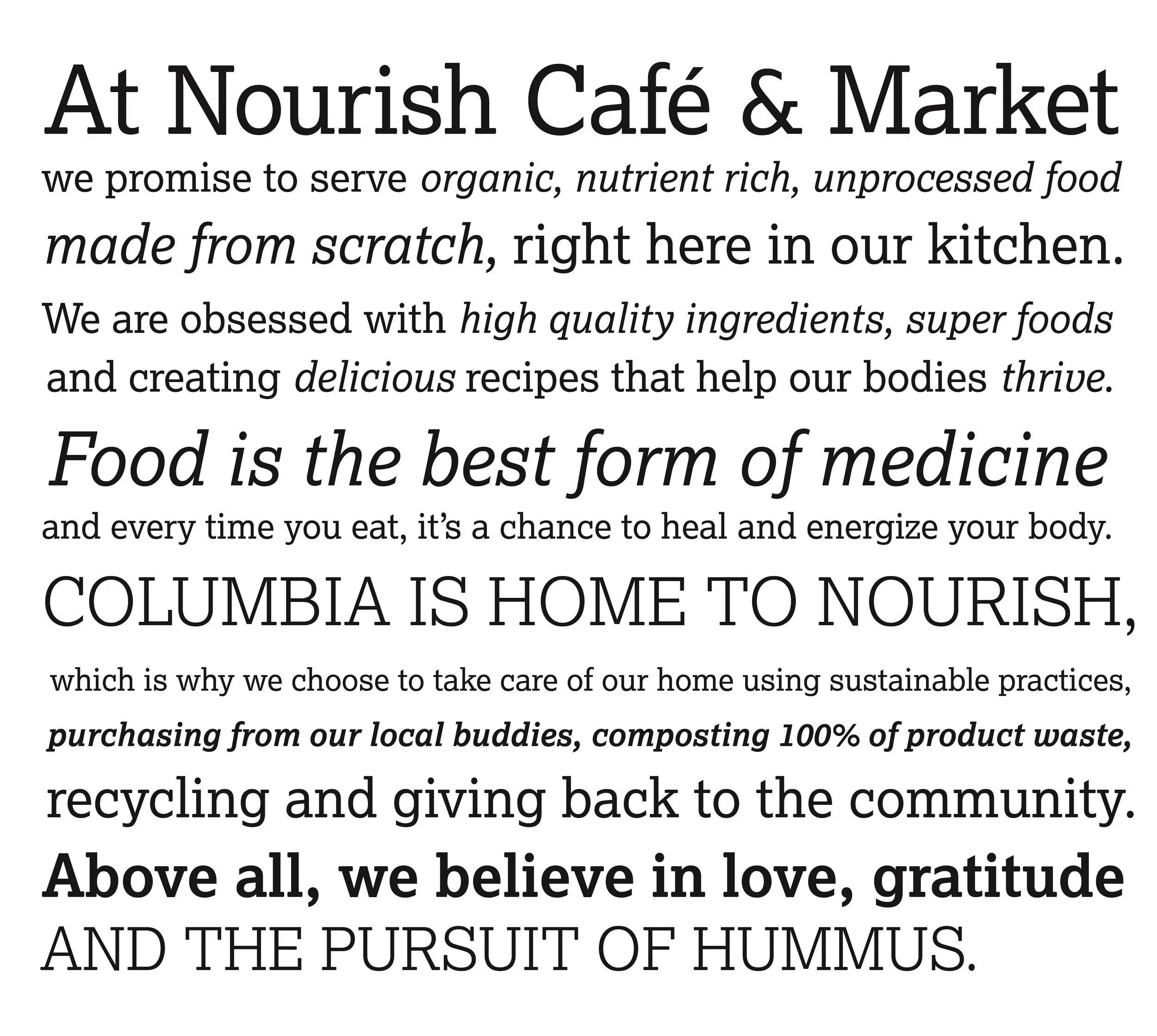 We make all of our sauces from scratch at Nourish so we can avoid added sugar (and so we don’t have to have preservatives in our food). We also create our smoothies with 1/2 a banana so we can keep sugar content in check. Did you know certain chain smoothie shops have the same sugar content as 2 sodas? Yikes! Yes fruit is waaaaaay healthier than soda but it doesn’t do anything for your blood sugar, hunger and hormones in that high of doses.